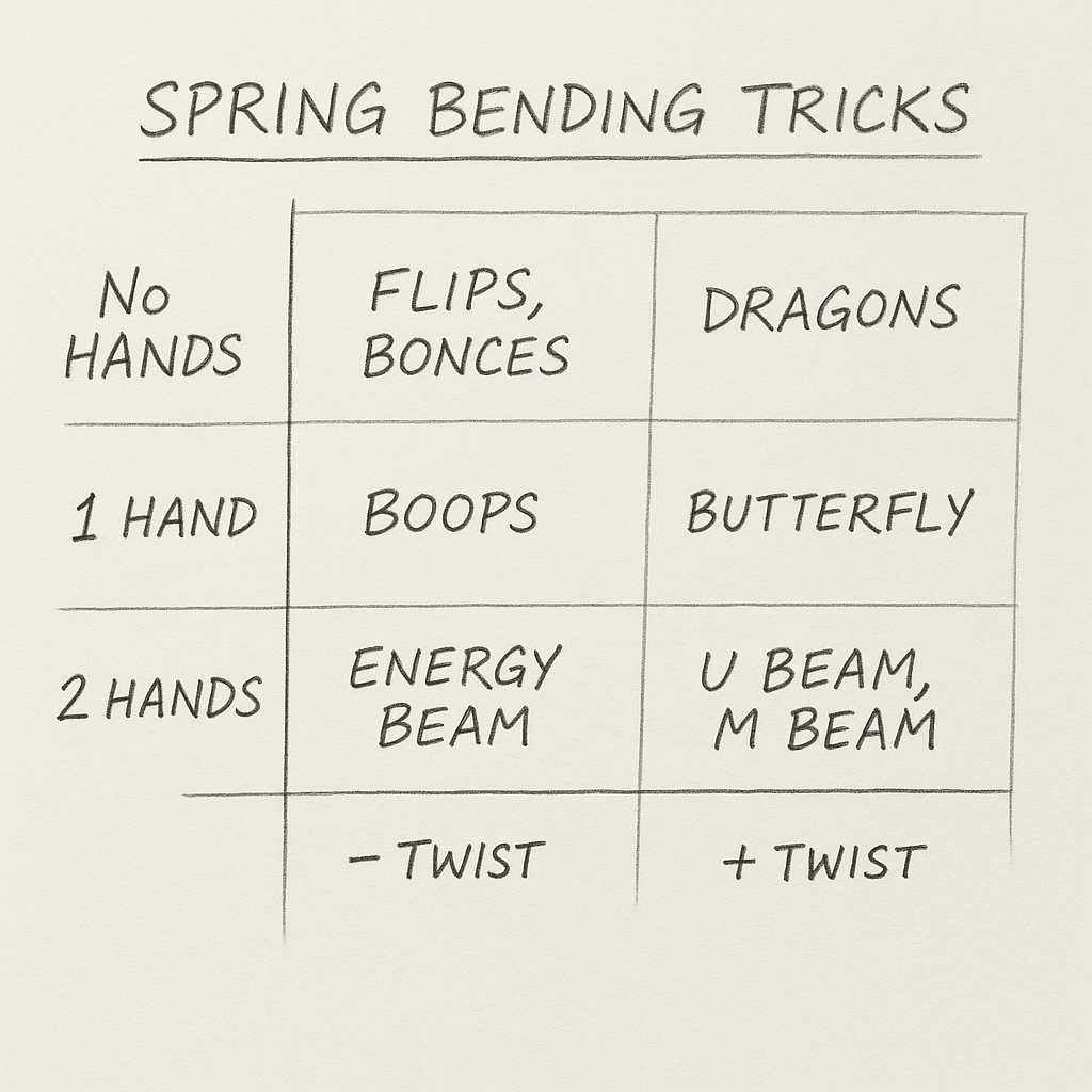 ¿Por que no clasificar los trucos por cantidad de manos que intervienen y complejidad de giros que le metemos al muelle?